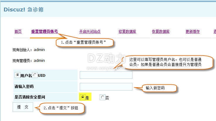 4.点击“重置管理员帐号”,输入管理员用户名和密码,清除安全提问,点击“提交”按钮即可。