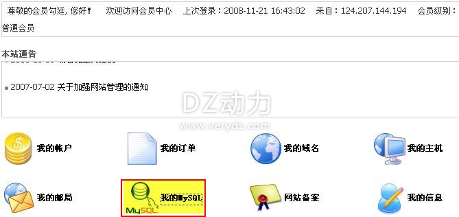 1、www.verydz.com登陆会员中心—>点击 我的MySQL