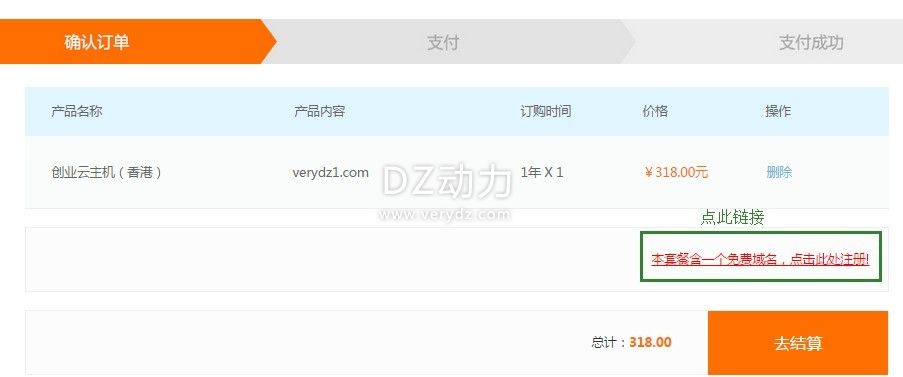 4、确认后进入购物车点击“本套餐含一个免费域名,点击此处注册”