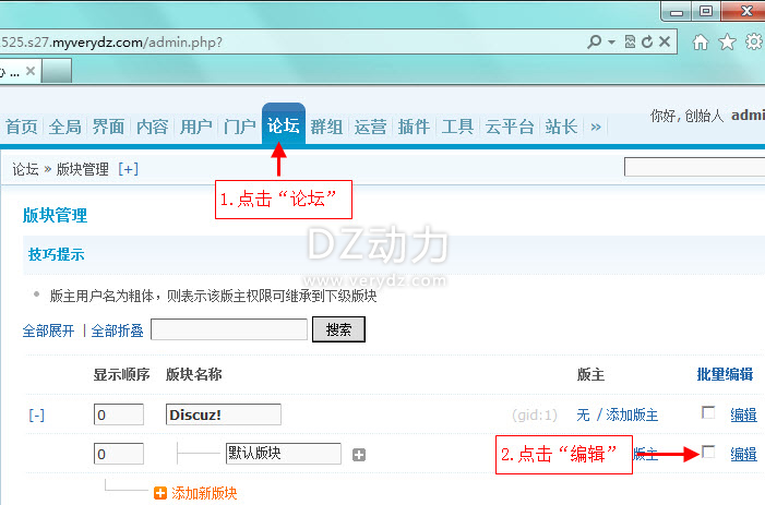 ,点击“论坛”,点击需要修改的版块名称后面的“编辑”,
