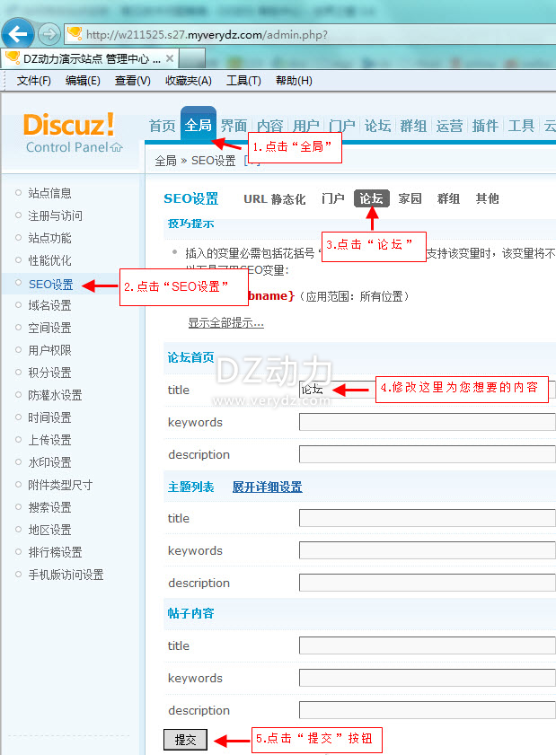 ,点击“全局》SEO设置》论坛”,title处把“论坛”修改成您要的文字,点击“提交”按钮即可。