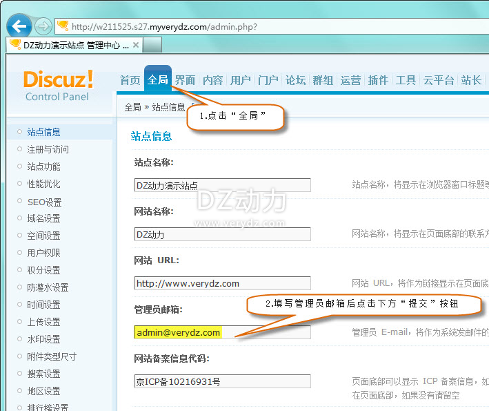 ,点击“全局”,修改“管理员邮箱”,把