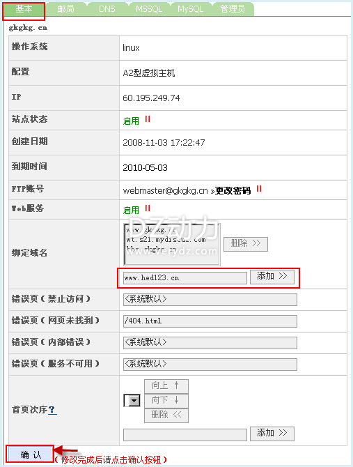 3)绑定主机 基本标签—>添加 新域名—>点击 确认